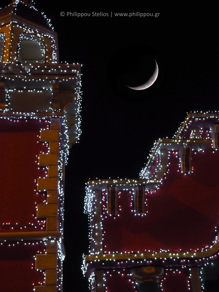 Το πάνω μέρος ενός στολισμένου χριστουγεννιάτικου κτιρίου ξεχωρίζει μέσα στη νύχτα, με το μισοφέγγαρο να αιωρείται σαν σιωπηλός παρατηρητής στο χειμωνιάτικο ουρανό. Μια εικόνα που μοιάζει βγαλμένη από παραμύθι.