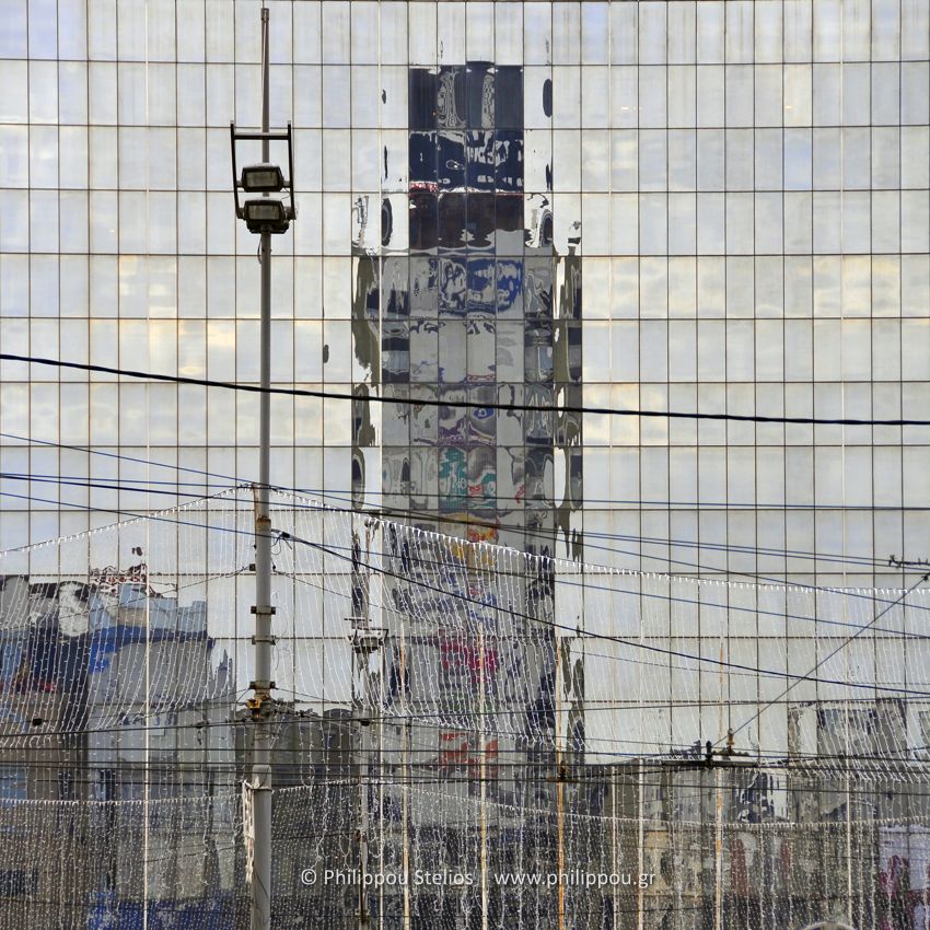 Το κτίριο καθρεφτίζεται κομματιασμένο, σαν μωσαϊκό από φως, γυαλί και σκιές. Καλώδια υφαίνουν τις γραμμές του ουρανού, και οι προσόψεις της πόλης γίνονται κύματα, ένα απρόβλεπτο σχέδιο που γεννιέται κάθε στιγμή.