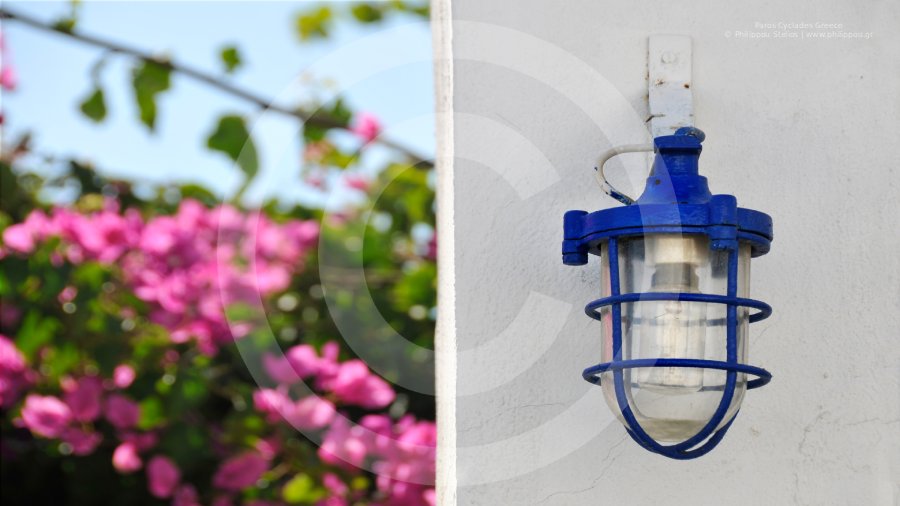 Μια κοντινή λήψη που συνδυάζει την έντονη ομορφιά της βουκαμβίλιας στα αριστερά με το κλασικό κυκλαδίτικο μπλε φανάρι (ναυτικού τύπου) στερεωμένο στον λευκό τοίχο στα δεξιά. Η φωτογραφία αποτυπώνει την ουσία του ελληνικού καλοκαιριού στην Πάρο, όπου το έντονο χρώμα της φύσης συναντά την παραδοσιακή νησιώτικη αρχιτεκτονική.