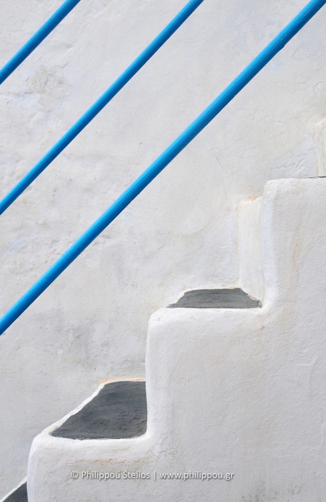 Σκαλοπάτια χαραγμένα στο φως του Αιγαίου, μια μπλε γραμμή που τα συνοδεύει, σαν μελωδία που σκαρφαλώνει σιωπηλά. Η απλότητα γίνεται ομορφιά, ένα μικρό κομμάτι νησιώτικης ψυχής που ανεβαίνει προς το φως.
