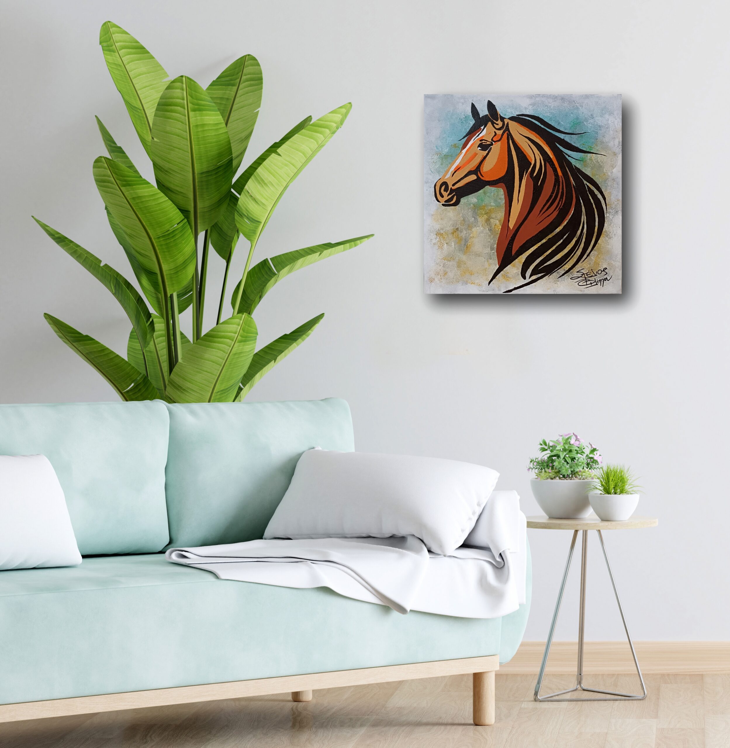 An expressive acrylic painting on canvas capturing the power and freedom of the horse through modern, flowing lines and warm earthy tones. The dynamic curves and the horse’s intense gaze bring a sense of motion and vitality, infusing your space with the spirit of nature and independence. Perfect for any room that calls for energy and inspiration.