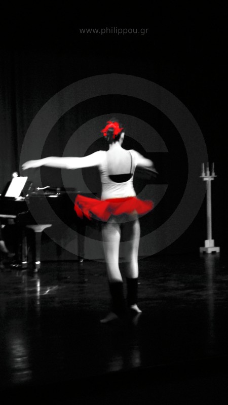 Η φιγούρα της μπαλαρίνας, βυθισμένη σε ένα ασπρόμαυρο σκηνικό, φωτίζεται από το κόκκινο της φούστας και της κορδέλας της. Ένα καλλιτεχνικό στιγμιότυπο όπου η κίνηση γίνεται φωτιά και το πάθος ξεχωρίζει μέσα από τη σιωπή του χώρου.