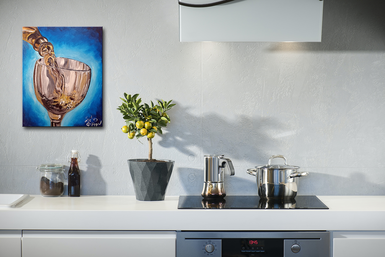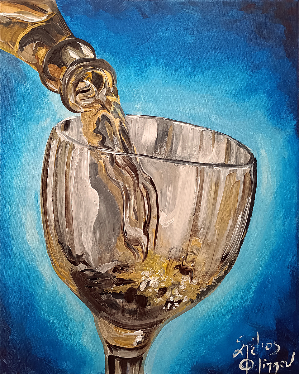 Ένας δυναμικός πίνακας ζωγραφικής σε καμβά, όπου η κίνηση του κρασιού καθώς χύνεται στο ποτήρι αιχμαλωτίζεται με ζεστές αποχρώσεις χρυσού και καφέ πάνω σε έντονο μπλε φόντο. Μια σύνθεση γεμάτη κίνηση, φως και ζωντάνια, ιδανική για χώρους με χαρακτήρα και έντονη προσωπικότητα.