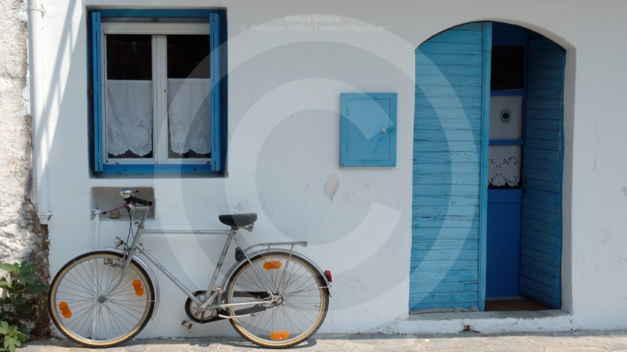 Ένα ασημένιο ποδήλατο στηρίζεται σε έναν τοίχο βαμμένο με τον κλασικό συνδυασμό λευκού και γαλάζιου που συναντάμε στα ελληνικά νησιά. Το σκηνικό είναι από τα Κύθηρα, με ένα ανοιχτό ξύλινο παράθυρο και μια πόρτα σε έντονη μπλε απόχρωση, που δημιουργούν μια ήσυχη, νησιώτικη ατμόσφαιρα.