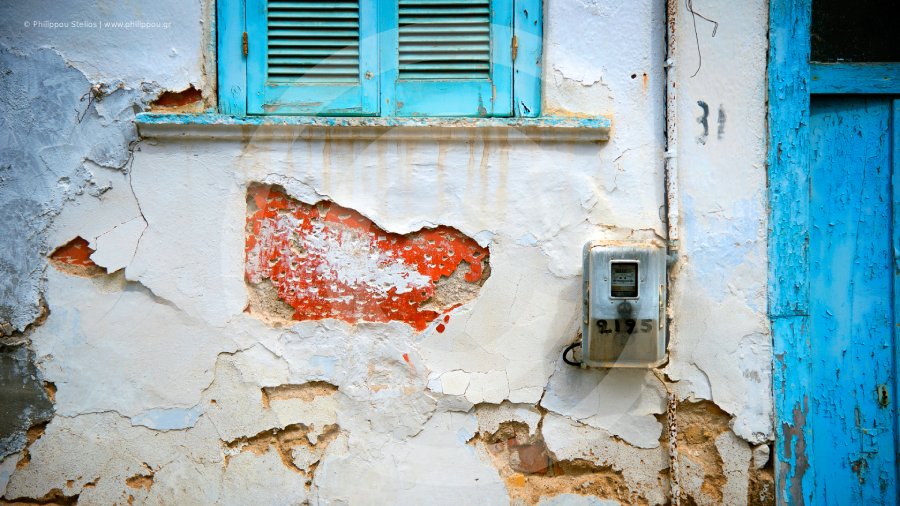 Μια κοντινή λήψη που εστιάζει στη φθορά του χρόνου και την αντίθεση των χρωμάτων σε μια παλιά πρόσοψη. Ο αποσαθρωμένος λευκός σοβάς αποκαλύπτει τα αρχικά, έντονα κόκκινα στρώματα του τοίχου, δημιουργώντας ένα δυναμικό, αφηρημένο μοτίβο. Στο πάνω μέρος, μπλε παράθυρα με περσίδες και μια μπλε πόρτα στα δεξιά πλαισιώνουν τη σκηνή, προσθέτοντας την κλασική ελληνική πινελιά. Ένας παλιός ηλεκτρικός πίνακας βρίσκεται στη μέση.