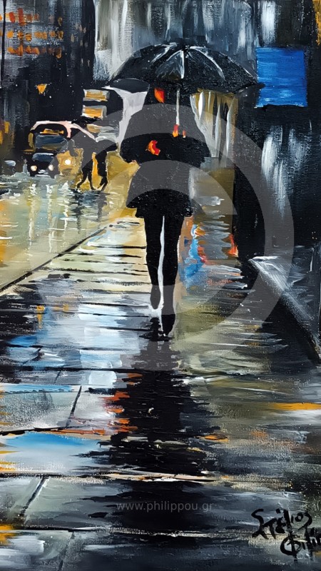Μια εντυπωσιακή ψηφιακή ταπετσαρία βασισμένη σε πίνακα ζωγραφικής, ιδανική για όσους αγαπούν την αστική τέχνη και τη μελαγχολία της βροχής.