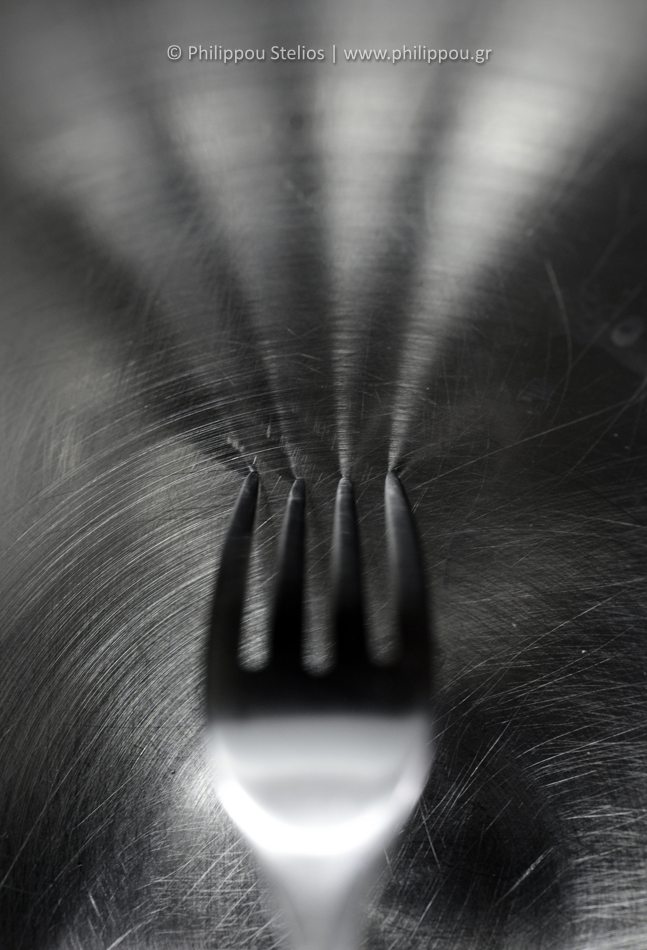 Μια απλή πιρουνιά, κι όμως το φως την υψώνει σε κάτι μαγικό. Οι ακτίνες απλώνονται σαν σιωπηλά μονοπάτια, σε μια θάλασσα από μέταλλο και σκιές. Εκεί όπου το συνηθισμένο γίνεται στιγμιαία αιώνιο.