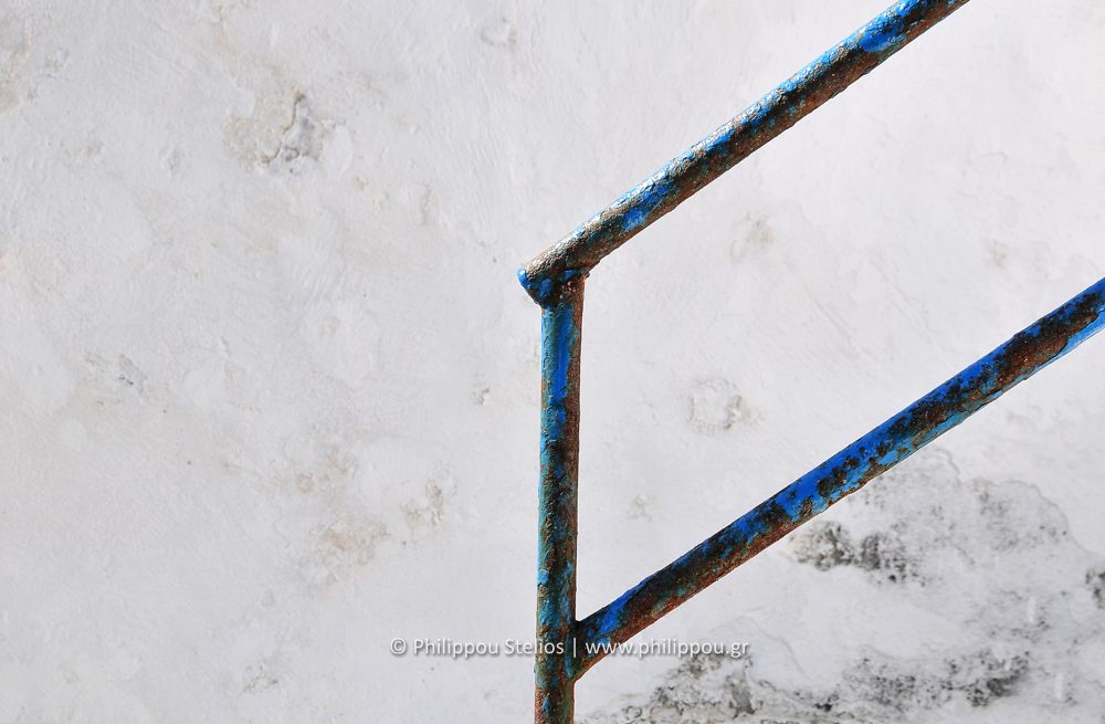 Μπλε σίδερο, φαγωμένο από τον χρόνο, κρατά ακόμη το σχήμα του μέσα στην απλότητα του λευκού. Η σκουριά γίνεται στολίδι, ένα αποτύπωμα ιστορίας επάνω στον τοίχο, εκεί που το φως και ο χρόνος συνθέτουν τη δική τους τέχνη.
