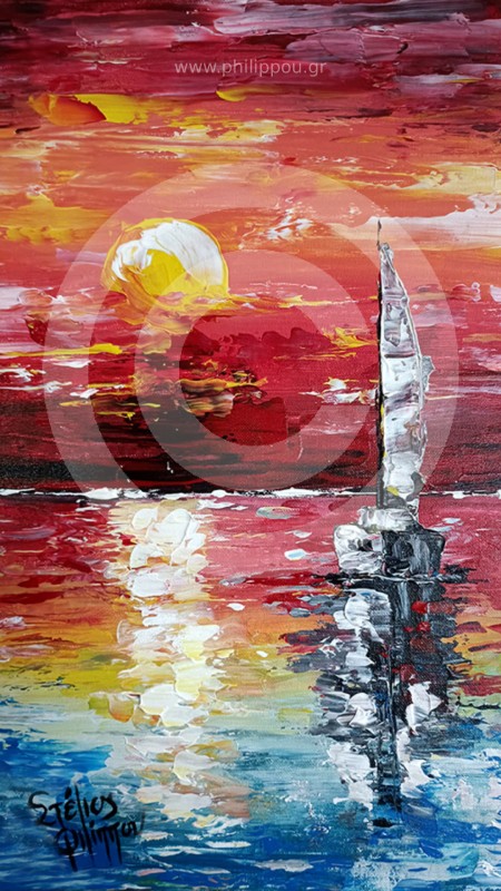 Μια εκρηκτική ψηφιακή ταπετσαρία βασισμένη σε πίνακα που αιχμαλωτίζει το πιο δραματικό ηλιοβασίλεμα. Οι έντονες αποχρώσεις του κόκκινου, πορτοκαλί και χρυσού κυριαρχούν στον ουρανό και αντανακλώνται στο νερό, δημιουργώντας μια αίσθηση φωτιάς πάνω στη θάλασσα.