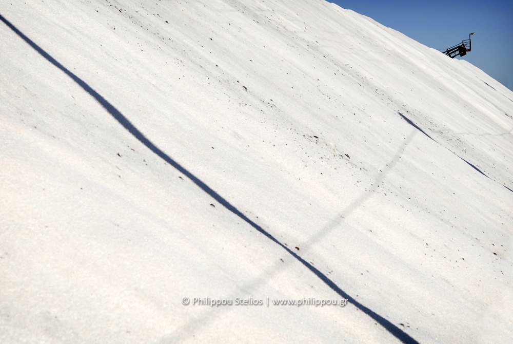 Μια λοξή ματιά στις αλυκές, εκεί όπου οι σκιές χαράζουν γραμμές πάνω στον απέραντο λευκό λόφο του αλατιού. Στο βάθος, η ταινία μεταφοράς διακρίνεται σαν μικρή φιγούρα στον ορίζοντα, δίνοντας στην εικόνα μια αίσθηση κλίμακας και απεραντοσύνης.