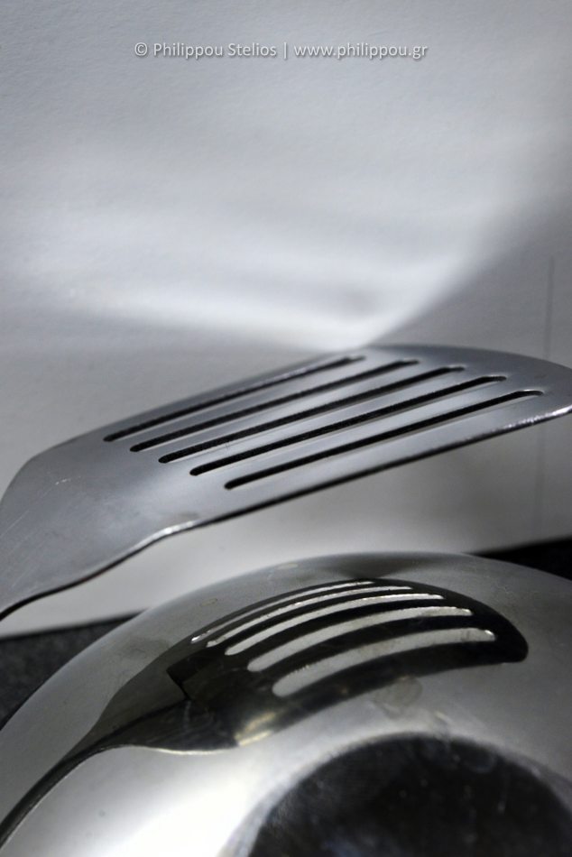 Η μεταλλική σπάτουλα ακουμπά το φως και το φως, παιχνιδιάρικο, χαράζει το είδωλό της πάνω στο καμπύλο ατσάλι. Μια απλή στιγμή κουζίνας που μοιάζει με μυστική τελετουργία.