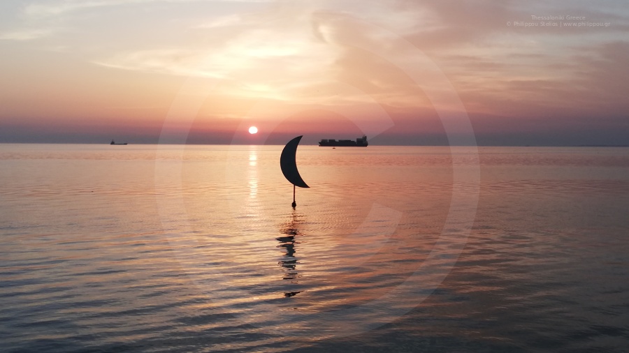Μια γαλήνια θαλασσογραφία που απαθανατίστηκε κατά το ηλιοβασίλεμα στον Θερμαϊκό Κόλπο της Θεσσαλονίκης. Ο ουρανός είναι ζωγραφισμένος σε απαλές αποχρώσεις του πορτοκαλί, του ροζ και του χρυσού. Στο προσκήνιο, ένα γλυπτό σε σχήμα μισοφέγγαρου βρίσκεται στα ήρεμα νερά, αντικατοπτρίζοντας το φως του ήλιου, με ένα πλοίο ορατό στον ορίζοντα.