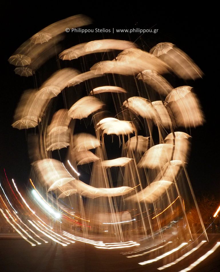 On Thessaloniki’s night seafront, Zongolopoulos’ metallic umbrellas seem to come alive. With a slight twist of the camera, they turn into dancing figures under the starry sky. A poetic gaze on art and motion.