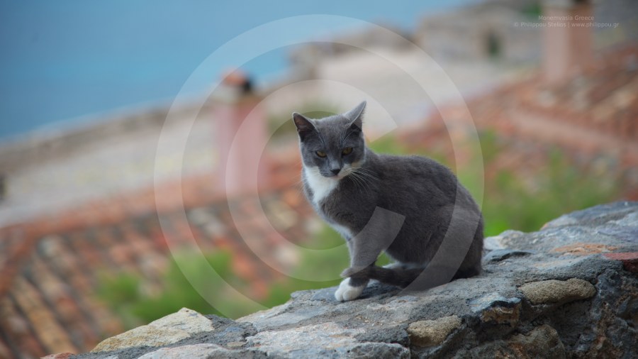 Ένα πορτρέτο μιας όμορφης γάτας που ποζάρει με χάρη πάνω σε ένα πέτρινο τείχος. Το βλέμμα της είναι έντονο και το σκηνικό πίσω της μαγευτικό, με τις κεραμιδένιες στέγες του κάστρου της Μονεμβασιάς και τη θάλασσα να χάνεται στο θολό βάθος. Η εικόνα αποτυπώνει την ηρεμία και την κλασική γοητεία του ιστορικού αυτού τόπου στην Ελλάδα.