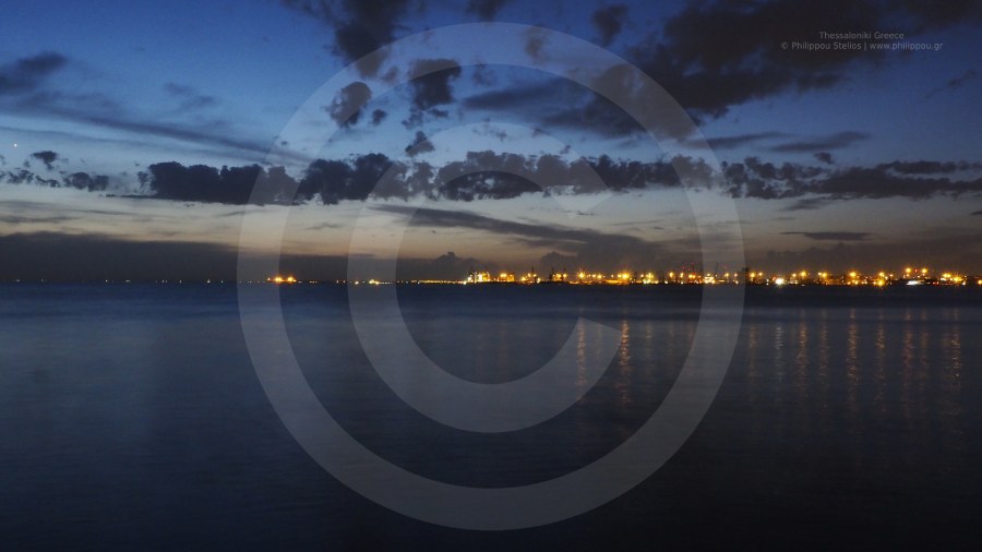 Μια ατμοσφαιρική νυχτερινή λήψη που αποτυπώνει την ηρεμία του Θερμαϊκού Κόλπου και την ενεργητική λάμψη της Θεσσαλονίκης στο βάθος. Τα φώτα της πόλης σχηματίζουν μια φωτεινή οριζόντια λωρίδα, με τις αντανακλάσεις τους να διαχέονται στα ήρεμα, μπλε-μαύρα νερά. Ο σκοτεινός ουρανός με τα λίγα σύννεφα προσθέτει βάθος και αίσθηση γαλήνης στο αστικό τοπίο.