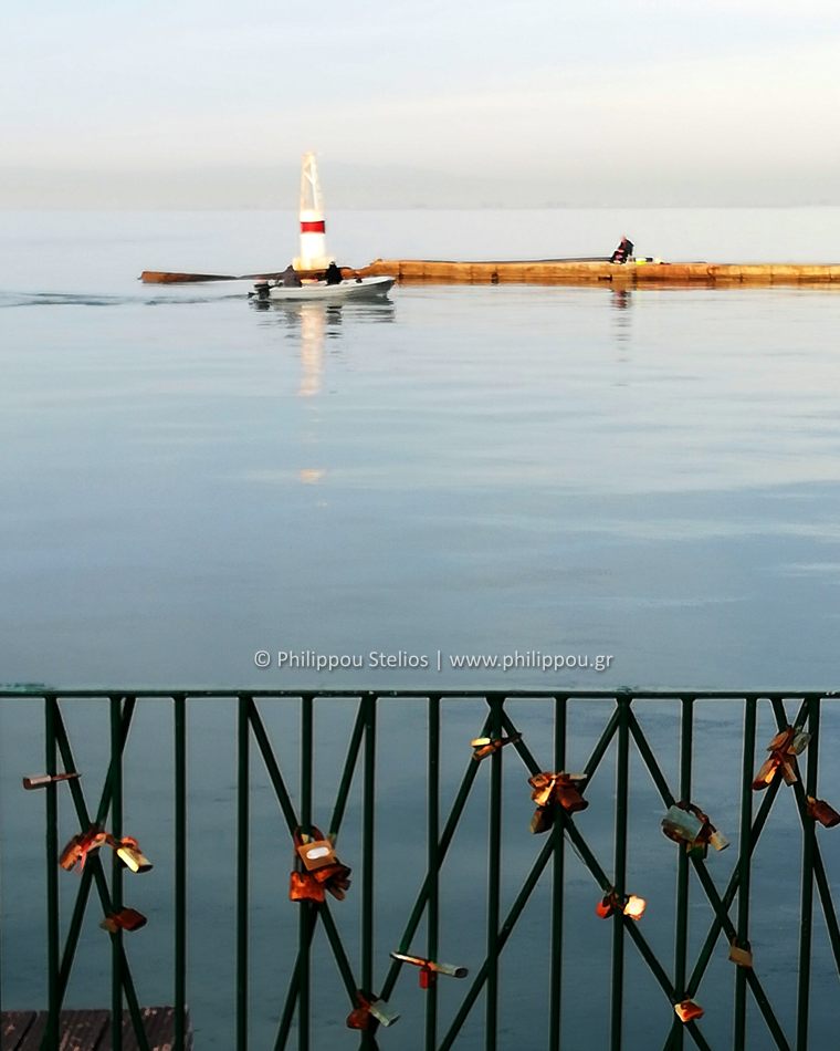 Ένα παλιό, σκουριασμένο κάγκελο στην παραλία της Θεσσαλονίκης κρατά επάνω του δεκάδες λουκέτα αγάπης — σύμβολα υποσχέσεων και συναισθημάτων. Στο βάθος, μια μικρή βάρκα πλέει ήσυχα προς τον φάρο, σαν να ακολουθεί το φως και μια εσωτερική φωνή. Μια εικόνα γεμάτη ρομαντισμό, παρελθόν και ελπίδα.