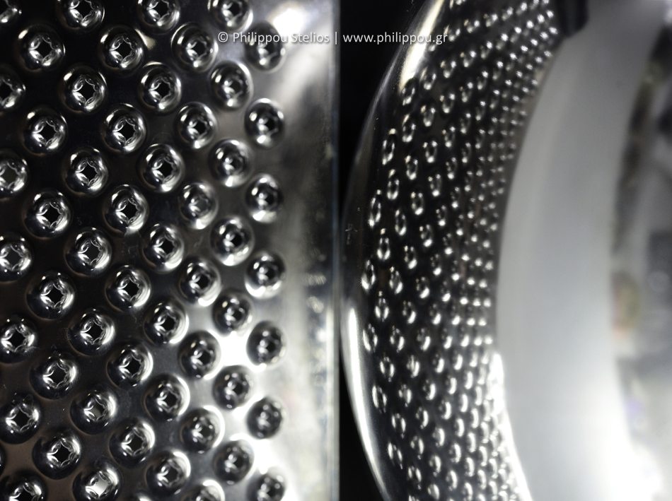 Μια επιφάνεια γεμάτη μικρές σιωπές από μέταλλο. Κάθε τρύπα, μια σπίθα φωτός, κάθε αντανάκλαση, ένα μικρό σύμπαν που κρύβεται στην κουζίνα. Η απλότητα γίνεται τέχνη, εκεί όπου το φως χορεύει πάνω στον χάλυβα.