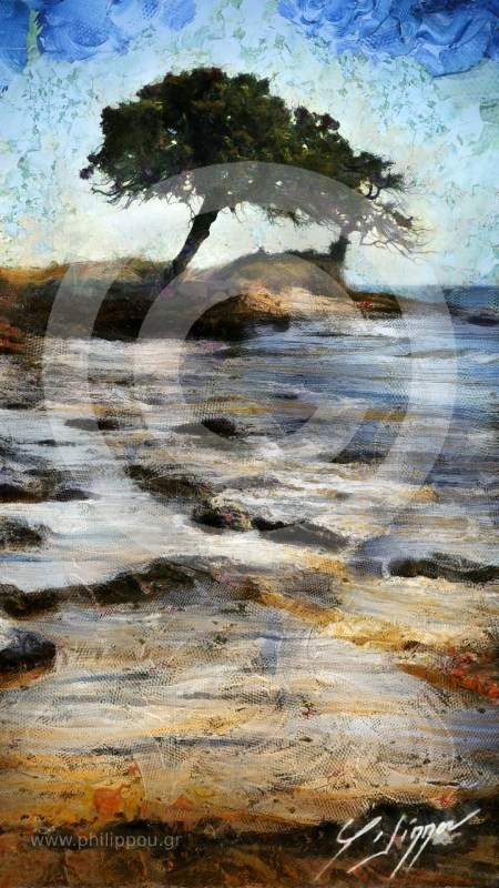 Μια μοναδική ψηφιακή ταπετσαρία βασισμένη σε πίνακα ζωγραφικής που αποπνέει την αίσθηση του ελληνικού καλοκαιριού και της φύσης. Το τοπίο παρουσιάζει ένα μοναχικό δέντρο να στέκεται αγέρωχο πάνω σε βράχια, με το νερό να κυλά στα πόδια του.