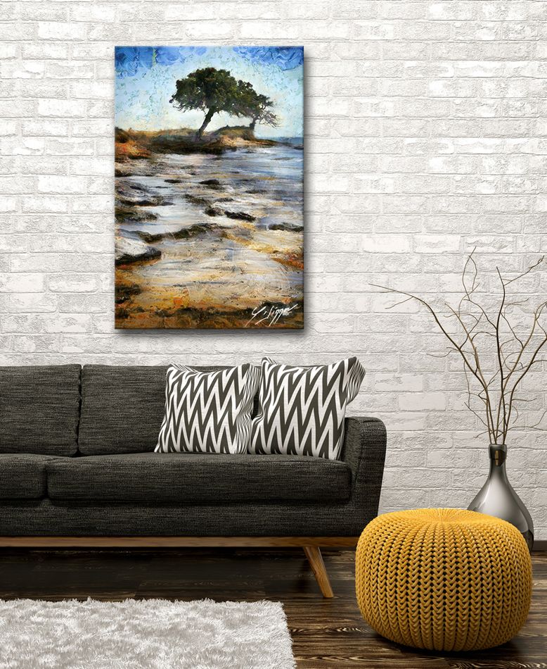 Two bowed trees, bound to the earth and the salt, stand as silent guardians of the horizon. The tide caresses the shore, leaving whispers, and the sky unfolds its blue like a prayer. Within the simplicity of the landscape, eternity breathes.