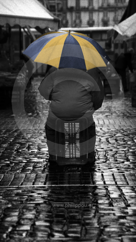 Μια συγκινητική φωτογραφία που αποτυπώνει έναν άνθρωπο καθισμένο σε καρέκλα στη μέση του βρεγμένου, λιθόστρωτου δρόμου. Το μαυρόασπρο φόντο έρχεται σε έντονη αντίθεση με την πολύχρωμη ομπρέλα, που γίνεται το κέντρο της σύνθεσης και σύμβολο προστασίας, μοναξιάς αλλά και ελπίδας. Ένα έργο με έντονη συναισθηματική δύναμη, ιδανικό για συλλέκτες φωτογραφίας και όσους αγαπούν την τέχνη με κοινωνικό και ποιητικό χαρακτήρα.