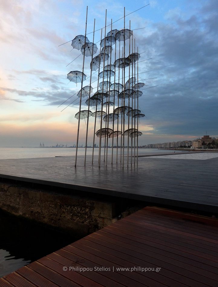 The iconic metallic umbrellas by Zongolopoulos stand against the sunset, overlooking the Thessaloniki waterfront. A modern artwork meets the natural magic of dusk, in a scene full of poetry and light.