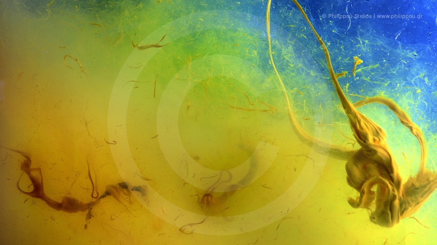 Μια αφηρημένη σύνθεση με στροβιλιζόμενες, ρευστές μορφές σε ζωηρούς κίτρινους και πράσινους τόνους, που έρχονται σε αντίθεση με ένα βαθύ μπλε φόντο.